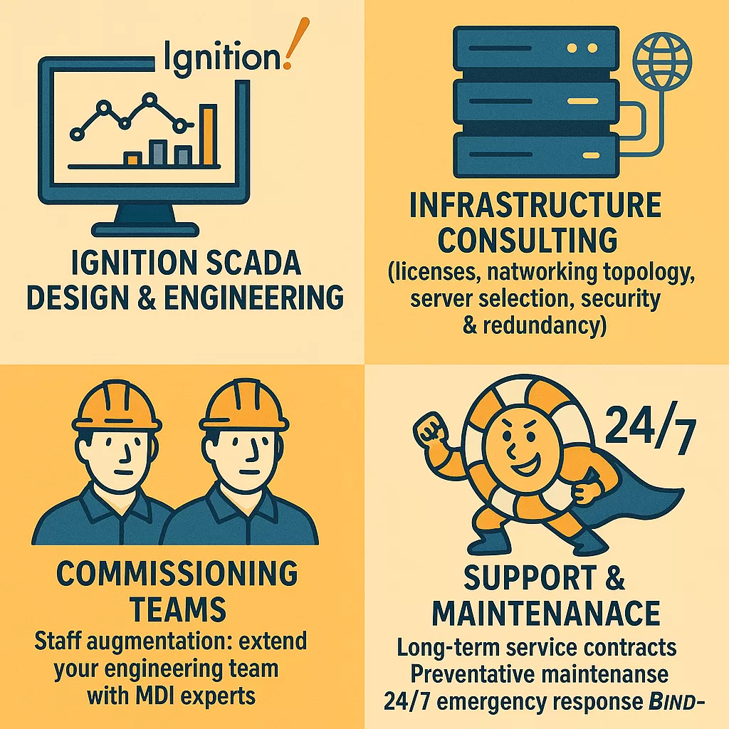 With a nationwide reach and rapid deployment capability, MDI supports projects of all sizes—from one-time engagements to long-term partnerships—while offering proven expertise in Ignition, flexible staffing options, and 24/7 reliability with emergency response. By collaborating closely with clients, we tailor solutions to meet the unique demands of each facility, empowering them to operate more efficiently, reduce risk, and succeed in a rapidly evolving digital landscape.
